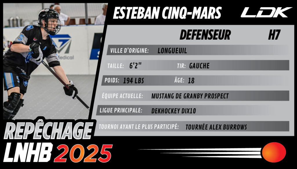 L’été dernier, Cinq-Mars a disputé cinq rencontres avec les Mustangs de Granby dans la LNHB Prospect. Lors de son passage avec le club-école des Mustangs, il a accumulé 11 points en 5 matchs !